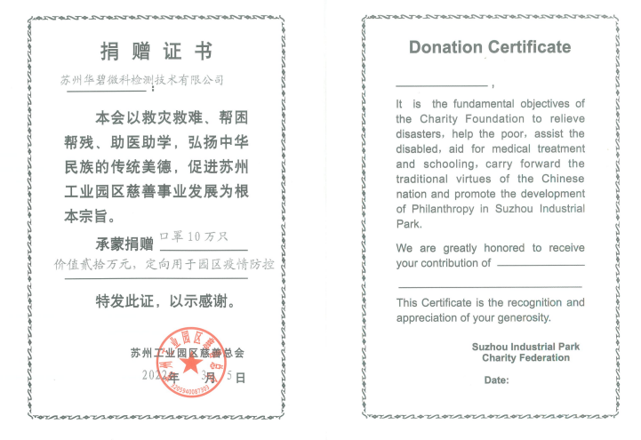 2022年2月25日,蘇州華碧微科檢測技術(shù)有限公司向蘇州工業(yè)園區(qū)慈善總會捐贈價格20萬元的防疫物資用于抗擊疫情。