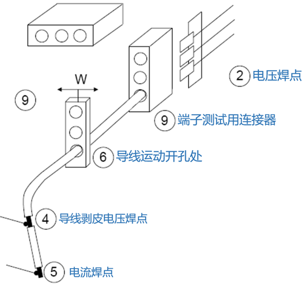 測試步驟必須按照圖2和圖3進行設置。焊點不能太靠近壓接區。導線上的第一個焊點不能比I1和I2更近,焊點必須包含所有的銅線。點4位置的導線要剝皮,不能切斷,剝皮是不能損傷到銅絲。