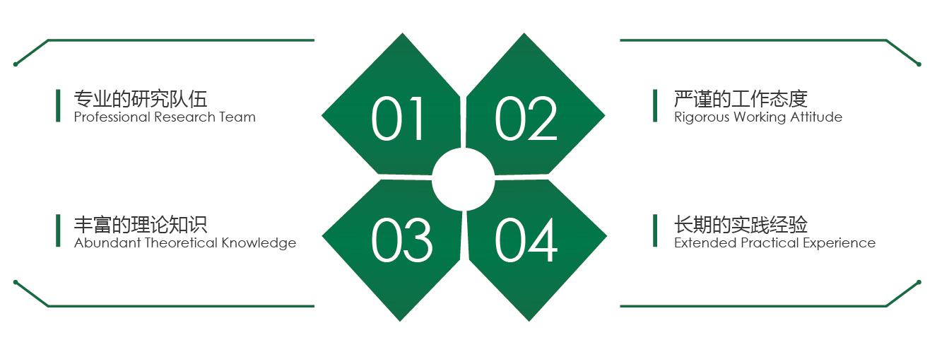 | 專業的研究隊伍 嚴謹的工作態度 豐富的理論知識 長期的實踐經驗 | Professional Research Team Rigorous Working Attitude Abundant Theoretical Knowledge Extended Practical Experience |