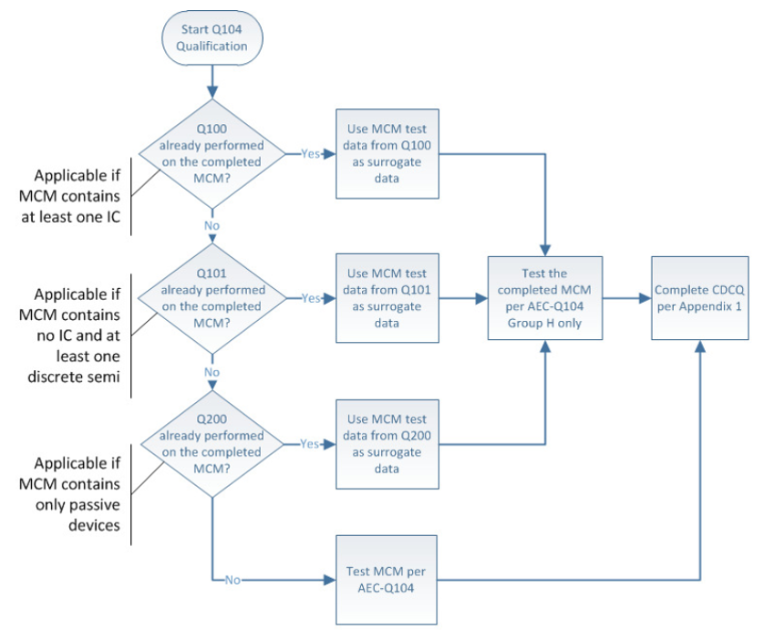 AEC-Q104上,為了依據MCM在汽車上實際使用環境,為復合式的環境,因此增加順序試驗,驗證通過的難度變高。例如,必須先執行完High Temp Operating Life(HTOL),才能做Thermal Shock(TS),顛倒過來就不行。AEC-Q104中針對MCM,增加H系列的測項;此外,針對零件本身的可靠性測試(Component Level Reliability),也增加了Thermal Shock(TS)及外觀檢視離子遷移(VISM)。